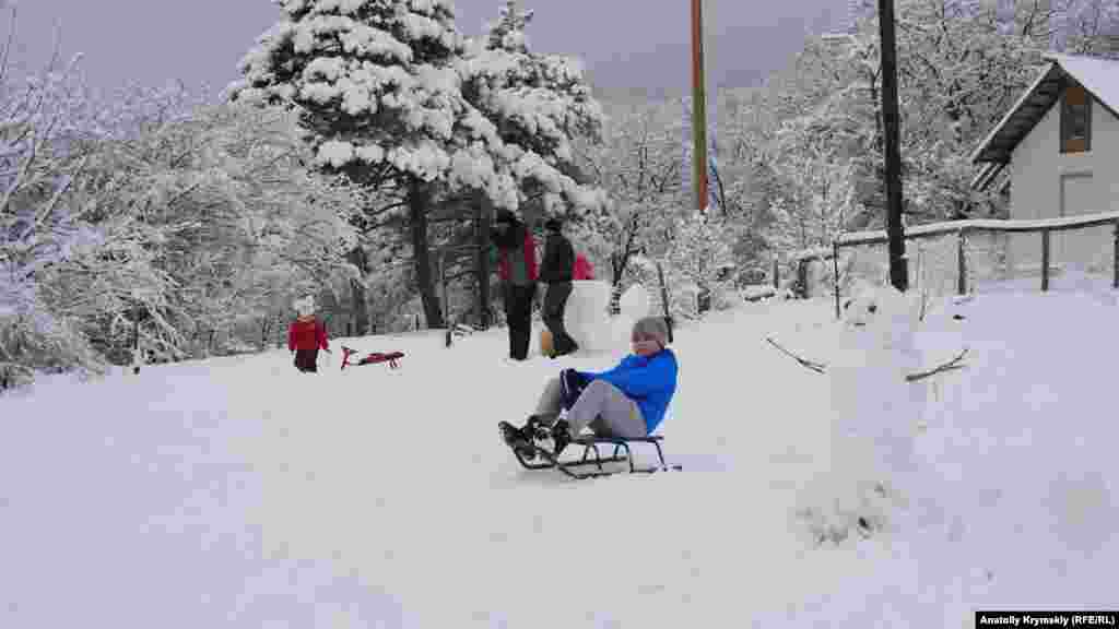 Буквально за день до наступления Нового года Ангарский перевал, как и другие горные массивы полуострова, особенно плато Ай-Петри, обильно засыпало снегом. При температуре чуть выше в дневное время он тут же начал таять, что, впрочем, не привело к дорожным заторам. На заезженном асфальте от него осталось мокрое место. А вот на деревьях и под ними в лесной горной местности снежный покров не уменьшился. Наоборот, только увеличивается, поскольку снег продолжает идти. Этим не преминули воспользоваться местные жители, отправившись с детьми на Ангарский район, в район подготовленного для активного зимнего отдыха учебного горнолыжного спуска возле старой турбазы.